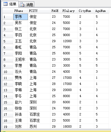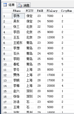 PARTITION BY來定義行的分區來進行聚合運算,與group by 不同,partition by 字句創建的分區是獨立于結果集的,創建的分區只是用于進行聚合運算,而且不同的開窗函數所創建的分區不互相影響,例如:查詢所有人員的信息,并查詢所屬城市的人員數以及同年齡的人員數: