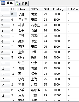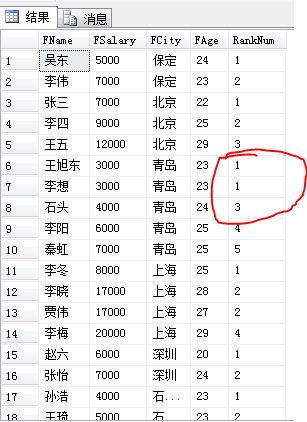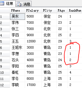 SELECT FName, FSalary, FCity, FAge, RANK() over(PARTITION BY FCITY ORDER BY FSalary) as RankNum FROM T_Person