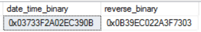 declare @dt datetime2(3)='2015-05-07 10:05:23.187'declare @dt_bi varbinary(max)=convert(varbinary(max), @dt) select @dt_bi as date_time_binary ,convert(varbinary(max),reverse(@dt_bi)) as reverse_binary