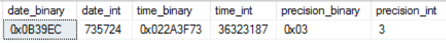 declare @dt datetime2(3)='2015-05-07 10:05:23.187'declare @dt_bi varbinary(max)=convert(varbinary(max), @dt) declare @dt_bi_littleEnd varbinary(max)select @dt_bi_littleEnd=convert(varbinary(max),reverse(@dt_bi))select substring(convert(varbinary(8), @dt_bi_littleEnd), 1, 3) as date_binary, cast(substring(convert(varbinary(8), @dt_bi_littleEnd), 1, 3) as int) as date_int, substring(convert(varbinary(8), @dt_bi_littleEnd), 4, 4) as time_binary, cast(substring(convert(varbinary(8), @dt_bi_littleEnd), 4, 4) as int) as time_int, substring(convert(varbinary(8), @dt_bi_littleEnd), 8, 1) as precision_binary, cast(substring(convert(varbinary(8), @dt_bi_littleEnd), 8, 1) as int) as precision_int;