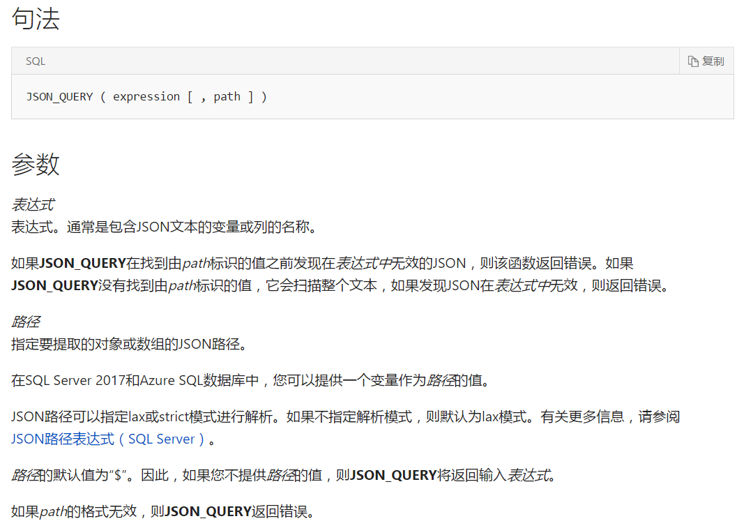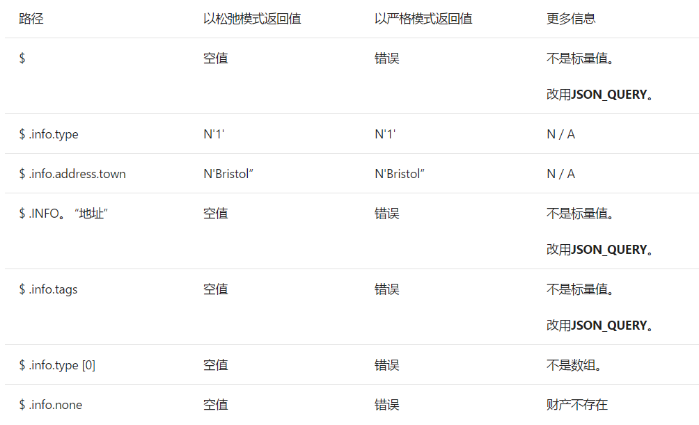 要從JSON字符串而不是標量值中提取對象或數(shù)組,請參閱JSON_QUERY(Transact-SQL)。有關JSON_VALUE和JSON_QUERY之間的差異的信息,請參閱比較JSON_VALUE和JSON_QUERY。