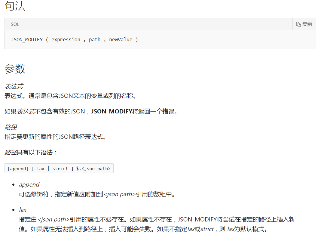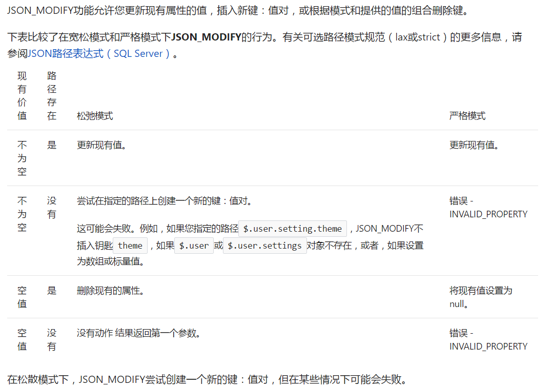 { "type":1, "address":{ "town":"Bristol", "county":"Avon", "country":"England" }, "tags":["Sport", "Water polo"] }4、JSON_MODIFY :更新 JSON 字符串中屬性的值,并返回已更新的 JSON 字符串。