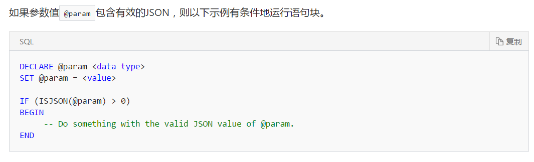 declare @param nvarchar(max);set @param = N'{ "info":{ "type":1, "address":{ "town":"Bristol", "county":"Avon", "country":"England" }, "tags":["Sport", "Water polo"] }, "type":"Basic" }';1、ISJSON:測試字符串是否包含有效 JSON。