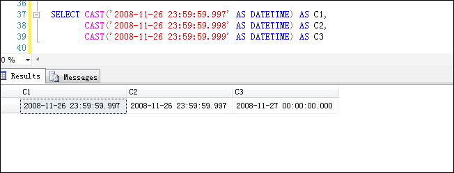 實驗測試驗證,998會轉換為997,而'2008-11-26 23:59:59.999'的話,就會轉換為'2008-11-27 00:00:00.000',如下截圖所示,所以尤其對數據精確性有要求的地方,要注意這些地方,否則SQL語句得出的結果在邏輯上就有誤。