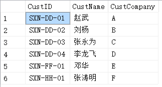 --CREATE TABLE CustomersCREATE TABLE Customers( CustID VARCHAR(50) NOT NULL, --顧客ID CustName VARCHAR(50),--顧客姓名 CustCompany VARCHAR(50) --顧客公司)--Initial CustomersINSERT INTO Customers VALUES('SXN-DD-01','趙武','A')INSERT INTO Customers VALUES('SXN-DD-02','劉楊','B')INSERT INTO Customers VALUES('SXN-DD-03','張永為','C')INSERT INTO Customers VALUES('SXN-DD-04','李龍飛','D')INSERT INTO Customers VALUES('SXN-FF-01','鄧華','E')INSERT INTO Customers VALUES('SXN-HH-01','張濤明','F')查詢結果為: