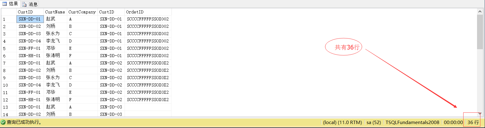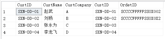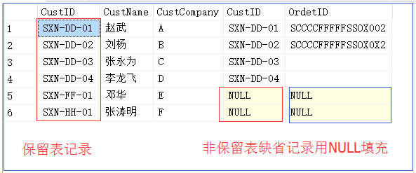如上以Cutomers表作為左保留表,連接右表Orders列CustID缺少SXN-FF-01和SXN-HH-01,為了以左保留表為基準,用NULL占位符來填充。