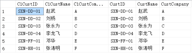 SELECT C1.CustID AS C1CustID,C1.CustName AS C1CustName,C1.CustCompany AS C1CustCompany,C2.CustID,C2.CustName,C2.CustCompany FROM Customers AS C1 JOIN Customers AS C2 ON C1.CustID=C2.CustID