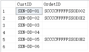CREATE TABLE Orders( CustID VARCHAR(50) NOT NULL, --顧客ID OrdetID VARCHAR(50) --訂單ID)--Initial OrdersINSERT INTO Orders VALUES('SXN-DD-01','SCCCCFFFFFSSOX002')INSERT INTO Orders VALUES('SXN-DD-02','SCCCCFFFFFSSOX0X2')INSERT INTO Orders VALUES('SXN-DD-03','')INSERT INTO Orders VALUES('SXN-DD-04','')INSERT INTO Orders VALUES('SXN-DD-05','SCCCCFFFFFSSOX0H2')INSERT INTO Orders VALUES('SXN-DD-06','')查詢結果為: