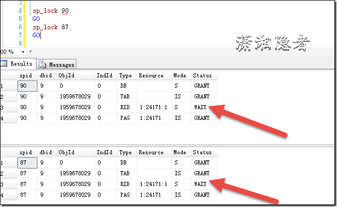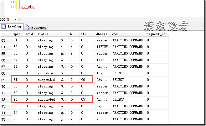 如下所示,你會看到SELECT語句“阻塞”了SELECT語句,即會話90“阻塞”了會話87, 它們的等待事件都為LCK_M_S,也就是說它們都在等待獲取共享鎖,也許你會置疑這個SQL是否有問題,那么我們使用SP_WHO來查看,你會發現也是如此,如下所示: