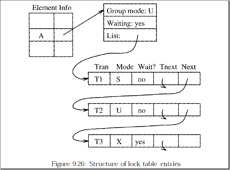 其實應該說,會話87、90都在等待RID對象的共享鎖,我們知道共享鎖與意向共享鎖都是兼容的,所以SELECT是不會阻塞SELECT的,那么又怎么解釋這個現象呢?在宋大神的指點下,粗略的翻了Database System Implementaion這本書(很多原理性知識,看起來相當吃力)。里面介紹了在鎖表(lock table)以及Element Info、Handling Lock Requests、Handling Unlocks等概念,有一個有意思的圖所示,