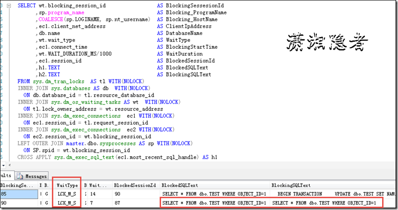 按照這些原則,當會話85釋放了排它鎖(X)后,調度器(Scheduler)應該會根據先后順序依次授予會話90、87共享鎖(S),兩者的阻塞會幾乎同時消失。 這個可以也可以通過實驗進行一個大概的推斷, 在上面實驗中,你可以手工取消90會話的查詢操作,然后再查看阻塞情況,就會發現會話87被85阻塞了。這個阻塞的源頭就變成了85,而不是90了。