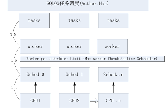 Worker又稱為WorkerThread,每個Worker跟一個線程,是Sql server任務的執行單位。 多個Worker對應一個Scheduler,公式Workers=max worker threads/onlines scheduler。在一個Scheduler上,同一時間只能有一個Worker運行。例如4個處理器的64位操作系統,它的每個Scheduler的Worker是512/4=128。