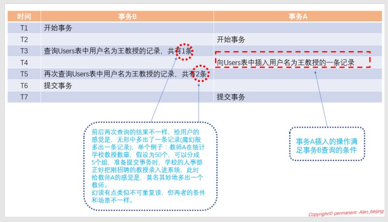 務(wù)插入新行,并且新行能滿足讀操作的查詢過(guò)濾條件,那么這些新行也會(huì)出現(xiàn)在第二次讀操作返回的結(jié)果中,這些新行稱(chēng)為幻影子,也叫做幻讀。