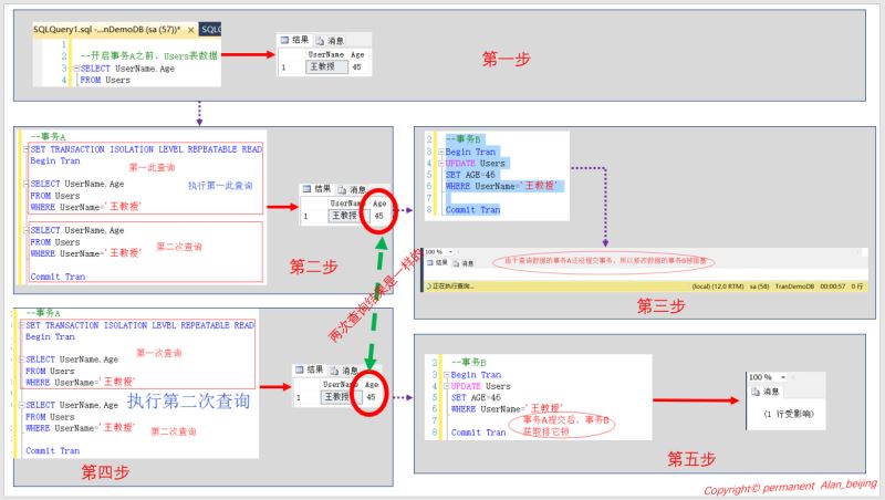 而且獲得的共享鎖一直保持到事務(wù)完成為止, 在該事務(wù)完成之前,其他事務(wù)不可能獲得排他鎖來(lái)修改這一數(shù)據(jù),如此,便實(shí)現(xiàn)了可重復(fù)讀,防止了不可重復(fù)讀造
