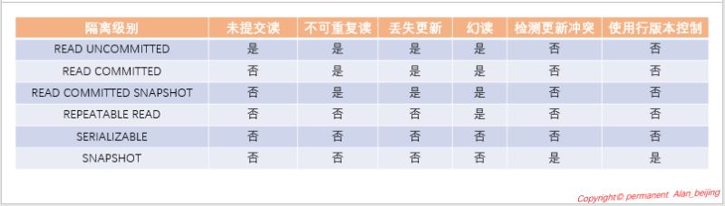 下表總結(jié)了每種隔離級(jí)別與邏輯一致性問(wèn)題,檢測(cè)沖突和行版本控制之間關(guān)系