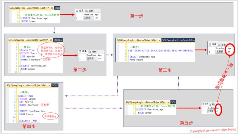 未提交讀是最低級(jí)的隔離級(jí)別,在這個(gè)隔離級(jí)別運(yùn)行的事務(wù),讀操作是不需要請(qǐng)求共享鎖的,如果讀操作不需要共享鎖,就不會(huì)產(chǎn)生與持有排它鎖的事務(wù)操作發(fā)生沖突,