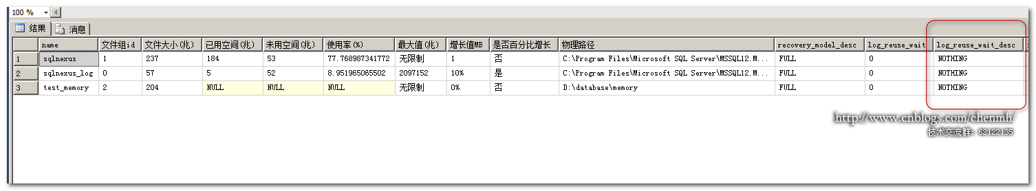 通過log_reuse_wait_desc的狀態可以看到當前數據庫已經無需日志備份,當然我已經執行過日志備份。