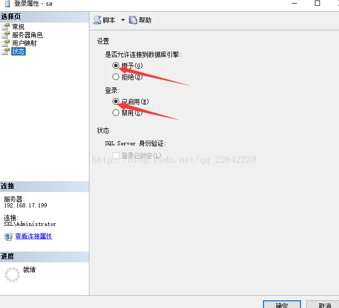 然后 點擊 連接實例下 的 安全性--->sa--->狀態,如下圖所示: