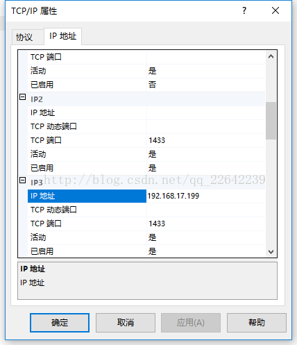 將你的本機的ip地址輸入到 IP3 中 我的本機的IP地址是192.168.17.199 將 TCP動態端口設為空,TCP端口設為1433 下面 活動和已啟用 選項改為 是