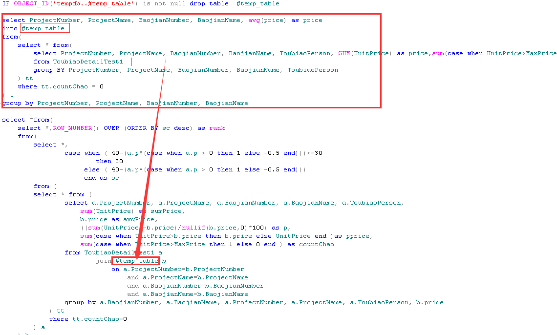 select *from( select *,ROW_NUMBER() OVER (ORDER BY sc desc) as rank from( select *, case when ( 40-(a.p*(case when a.p > 0 then 1 else -0.5 end)))<=30 then 30 else ( 40-(a.p*(case when a.p > 0 then 1 else -0.5 end))) end as sc from ( select * from ( select a.ProjectNumber, a.ProjectName, a.BaojianNumber, a.BaojianName, a.ToubiaoPerson, sum(UnitPrice) as sumPrice, b.price as avgPrice, ((sum(UnitPrice)-b.price)/nullif(b.price,0)*100) as p, sum(case when UnitPrice>b.price then b.price else UnitPrice end )as pprice, sum(case when UnitPrice>MaxPrice then 1 else 0 end ) as countChao from ToubiaoDetailTest1 a join ( select ProjectNumber, ProjectName, BaojianNumber, BaojianName, avg(price) as price from( select * from( select ProjectNumber, ProjectName, BaojianNumber, BaojianName, ToubiaoPerson, SUM(UnitPrice) as price, SUM(case when UnitPrice>MaxPrice then 1 else 0 end ) as countChao from ToubiaoDetailTest1 group BY ProjectNumber, ProjectName, BaojianNumber, BaojianName, ToubiaoPerson ) tt where tt.countChao = 0 ) t group by ProjectNumber, ProjectName, BaojianNumber, BaojianName ) b on a.ProjectNumber=b.ProjectNumber and a.ProjectName=b.ProjectName and a.BaojianNumber=b.BaojianNumber and a.BaojianName=b.BaojianName group by a.BaojianNumber, a.BaojianName, a.ProjectNumber, a.ProjectName, a.ToubiaoPerson, b.price ) tt where tt.countChao=0 ) a ) b) t order by rank