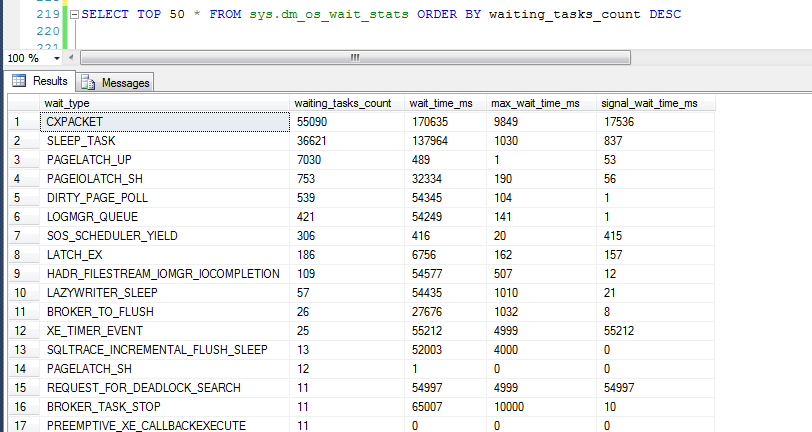 在SQL Server中有一個系統視圖sys.dm_os_wait_stats記錄了自數據庫服務啟動以來累積產生的等待信息,