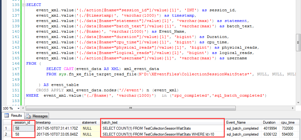 -- Parse the XML to show rpc_completed,sql_batch_completed detailsif object_id('tempdb..#t1') is not null drop table #t1SELECT event_xml.value('(./action[@name="session_id"]/value)[1]', 'INT') as session_id, event_xml.value('(./@timestamp)', 'varchar(1000)') as timestamp, event_xml.value('(./data[@name="statement"]/value)[1]', 'varchar(max)') as statement, event_xml.value('(./data[@name="batch_text"]/value)[1]', 'varchar(max)') as batch_text, event_xml.value('(./@name)', 'varchar(1000)') as Event_Name, event_xml.value('(./data[@name="duration"]/value)[1]', 'bigint') as Duration, event_xml.value('(./data[@name="cpu_time"]/value)[1]', 'bigint') as cpu_time, event_xml.value('(./data[@name="physical_reads"]/value)[1]', 'bigint') as physical_reads, event_xml.value('(./data[@name="logical_reads"]/value)[1]', 'bigint') as logical_reads, event_xml.value('(./action[@name="username"]/value)[1]', 'varchar(max)') as usernameINTO #t1FROM ( SELECT CAST(event_data AS XML) xml_event_data FROM sys.fn_xe_file_target_read_file(N'D:/XEventFiles/CollectionSessionWaitStats*', NULL, NULL, NULL) ) AS event_tableCROSS APPLY xml_event_data.nodes('//event') n (event_xml)WHERE event_xml.value('(./@name)', 'varchar(1000)') in ('rpc_completed','sql_batch_completed')order by Event_Name-- Parse the XML to show wait_info,wait_info_external detailsif object_id('tempdb..#t2') is not null drop table #t2SELECT cast(event_xml.value('(./@timestamp)', 'varchar(1000)') as DATETIME2) as timestamp, event_xml.value('(./data[@name="duration"]/value)[1]', 'bigint') as duration, event_xml.value('(./action[@name="session_id"]/value)[1]', 'INT') as session_id, event_xml.value('(./data[@name="wait_type"]/text)[1]', 'VARCHAR(200)') as wait_typeINTO #t2FROM ( SELECT CAST(event_data AS XML) xml_event_data FROM sys.fn_xe_file_target_read_file(N'D:/XEventFiles/CollectionSessionWaitStats*', NULL, NULL, NULL) ) AS event_table CROSS APPLY xml_event_data.nodes('//event') n (event_xml)WHERE event_xml.value('(./@name)', 'varchar(1000)') in ('wait_info','wait_info_external')if object_id('tempdb..#t3') is not null drop table #t3SELECT a.session_id AS SessionId, isnull(statement,batch_text) AS SQLTEXT, a.Duration AS TotalExecuteTime, CAST(a.timestamp AS DATETIME2) AS CompletedTime, CAST(b.timestamp AS DATETIME2) AS WaitTypeStartTime, b.wait_type AS WaitType, b.duration AS WaitDurationINTO #t3FROM #t1 a INNER JOIN #t2 b on a.session_id = b.session_id and b.timestamp < a.timestamp and b.timestamp>( select top 1 timestamp from #t1 c where a.session_id = a.session_id and a.timestamp > b.timestamp order by a.timestamp )select case when rn = 1 then SessionId else NULL end as SessionId, case when rn = 1 then SQLTEXT else NULL end as SQLTEXT, case when rn = 1 then TotalExecuteTime else NULL end as TotalExecuteTime, CompletedTime as CompletedTime, WaitType, WaitTypeStartTime as WaitTypeStartTime, WaitDurationfrom ( select ROW_NUMBER()over(partition by SessionId,SQLTEXT,TotalExecuteTime,CompletedTime order by CompletedTime,WaitTypeStartTime) as rn, * FROM #t3)當然該語句僅供參考,目的是為了收集Session級的統計信息,當收集到Session級別的統計信息之后,具體的統計方式也不難。