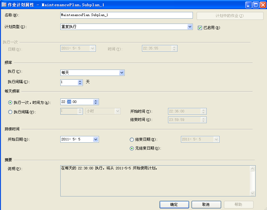 那么,我們?cè)O(shè)置為 每晚 22:38觸發(fā),然后點(diǎn)擊確定,最后點(diǎn)擊“ctrl+s”進(jìn)行保存,就會(huì)發(fā)現(xiàn),在維護(hù)計(jì)劃中和sqlServer代理的作業(yè)中,會(huì)生成兩個(gè)名稱分別為: