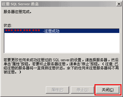 9、顯示注冊成功。(如果總是提示失敗,請檢查您的局域網是否開放了1433端口,同時檢查您的SQL鏈接超時時間,SQL默認超時時間為4秒,建議改成60秒---在SQLserver企業管理器=>工具=>選項=>高級。)