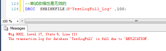 4,步驟3完成之后,事務日志被標記為正常狀態,如果是簡單還原模式,被后臺進程解析過的事務日志被截斷,可以重用如果上述中間的第三個步驟出現問題,也即后臺進程無法解析日志后釋放可用的日志空間,再次往數據庫中寫入操作,就會出現:數據庫“TestDB”的事務日志已滿,原因為“REPLICATION”的情況