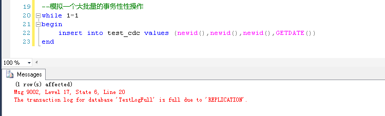 在建庫的時候日志文件有限制成了512M,因為這個表上開啟了CDC,寫數據這個過程會產生事務日志,日志有空空間限制在寫入數據的過程中,一開始是沒有問題的,隨著數據的不斷寫入(Replication狀態的日志不斷積壓),當日志全部使用之后,下面的報錯就會產生了