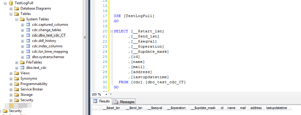 USE TestLogFull--啟用CDCEXECUTE sys.sp_cdc_enable_db;GO--創建一張測試表create table test_cdc( id int identity(1,1) primary key, name nvarchar(50), mail varchar(50), address nvarchar(50), lastupdatetime datetime)--對表啟用CDCEXEC sys.sp_cdc_enable_table @source_schema = 'dbo', @source_name = 'test_cdc', @role_name = 'cdc_admin', @capture_instance = DEFAULT, @supports_net_changes = 1, @index_name = NULL, @filegroup_name = DEFAULT