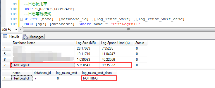 根據本人的測試,在執行上面的語句,將復制的事物標記為已分發之后,再次查看日志使用率,發現還是100%,但是嘗試寫入數據的時候是成功的,再次寫入數據(一條即可)之后,日志空間開始釋放,應該是寫入時候的時候觸發被標記為已分發的日志截斷,也就是將上面占用了100%的日志空間釋放出來然后再觀察日志的使用率,發現如預期的,這部分日志已被截斷,日志空間不再是被完全占用了,日志變成Nothing狀態(可重用)