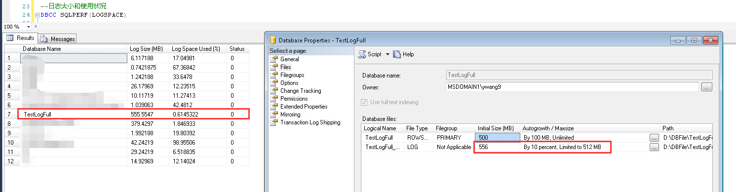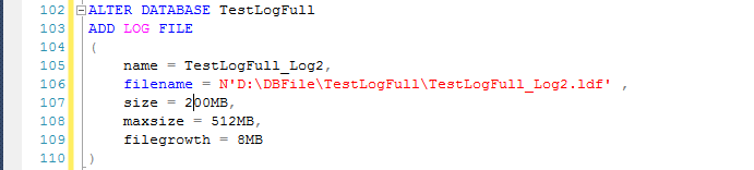 USE masterGOCREATE DATABASE TestLogFull ON PRIMARY ( NAME = N'TestLogFull', FILENAME = N'D:/DBFile/TestLogFull/TestLogFull.mdf' , SIZE = 500MB , MAXSIZE = UNLIMITED, FILEGROWTH = 100MB )LOG ON ( NAME = N'TestLogFull_log', FILENAME = N'D:/DBFile/TestLogFull/TestLogFull_Log.ldf' , SIZE = 1MB , MAXSIZE = 512MB )