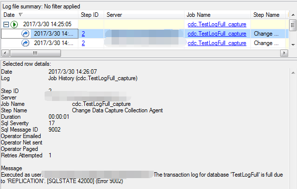 開啟代理,查看CDC作業的執行情況,會發現,此時代理作業也不好使了,作業執行的時候并沒有成功,一樣提示說事務日志已滿