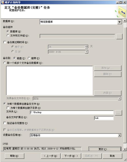 這個界面實在太長了,我把任務欄隱藏了都顯示不完,出現了滾動條,這里我們選擇要進行備份的數據庫,選擇為每個數據庫創建備份文件,文件保存在C盤Backup目錄下,擴展名是bak,出于安全起見,我們可以選中“驗證備份完整性”,當然也可以不選。在SQL2008中提供了壓縮備份的新特性,使得備份文件更小,備份速度更快,這里我們就是由壓縮備份。最后是選擇執行計劃,我這里選的是每周日晚上0點的時候執行。