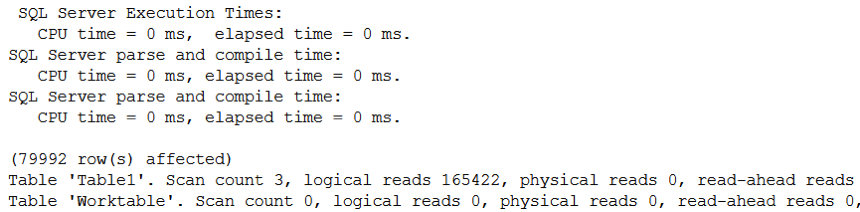 執(zhí)行計(jì)劃看起來(lái)非常恐怖(查詢優(yōu)化器甚至啟用了并行計(jì)劃!),因?yàn)闀灢檎疫\(yùn)算符這里執(zhí)行了80000次,查詢本身產(chǎn)生了超過(guò)165000個(gè)邏輯讀!(邏輯讀個(gè)數(shù)可以從STATISTIC IO里獲取)。