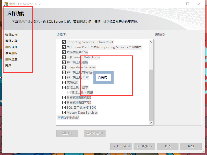 第五步,當到了準備刪除時候,點擊下一步,由于SQL server 2012真的很大,刪除進度這一步很慢,大概需要半個小時時間,只需要慢慢等待就行。