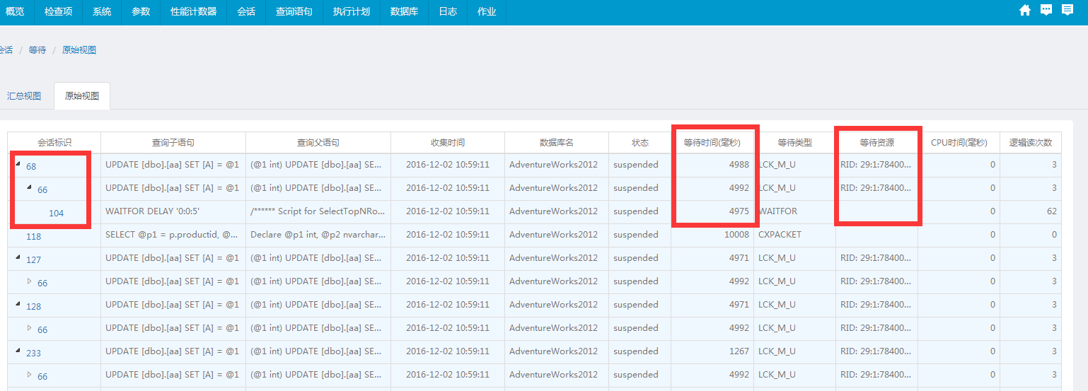 語句具體的等待情況時怎樣的呢?我們可以通過【原始視圖】查看具體語句在執行過程中的真實阻塞情況