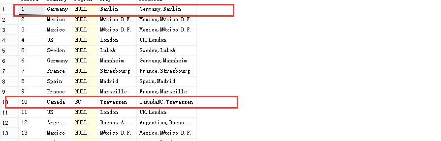 USE TSQL2012GOSELECT custid, country, region, city,country + CONCAT(country,N''+ region, N',' + city) AS locationFROM Sales.Customers