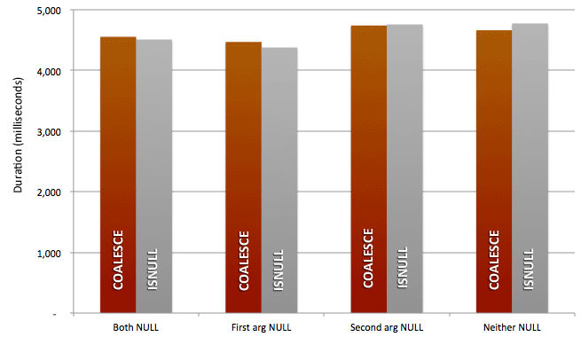 DBCC DROPCLEANBUFFERS;DECLARE @a VARCHAR(5), -- = 'str_a', -- this line changed per test @b VARCHAR(5), -- = 'str_b', -- this line changed per test @v VARCHAR(5), @x INT = 0, @time DATETIME2(7) = SYSDATETIME();WHILE @x <= 500000BEGIN SET @v = COALESCE(@a, @b); --COALESCE SET @x += 1;ENDSELECT DATEDIFF(MILLISECOND, @time, SYSDATETIME());GODBCC DROPCLEANBUFFERS;DECLARE @a VARCHAR(5), -- = 'str_a', -- this line changed per test @b VARCHAR(5), -- = 'str_b', -- this line changed per test @v VARCHAR(5), @x INT = 0, @time DATETIME2(7) = SYSDATETIME();WHILE @x <= 500000BEGIN SET @v = ISNULL(@a, @b); --ISNULL SET @x += 1;ENDSELECT DATEDIFF(MILLISECOND, @time, SYSDATETIME());