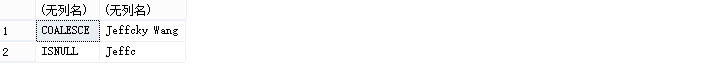 DECLARE @c5 VARCHAR(5);SELECT 'COALESCE', COALESCE(@c5, 'Jeffcky Wang')UNION ALLSELECT 'ISNULL', ISNULL(@c5, 'Jeffcky Wang');