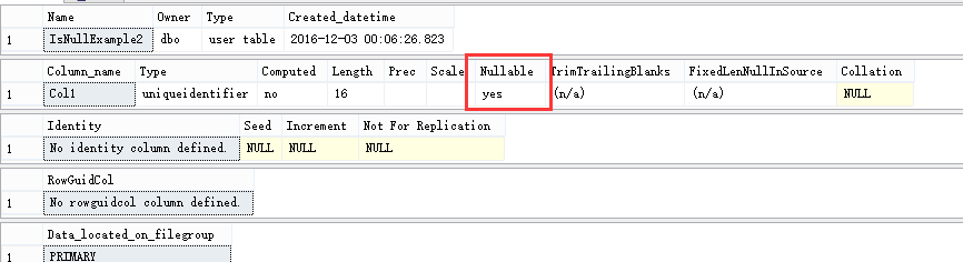SELECT ISNULL(NEWID(), 'JeffckyWang') AS Col1INTO dbo.IsNullExample2;EXEC sp_help 'dbo.IsNullExample2';