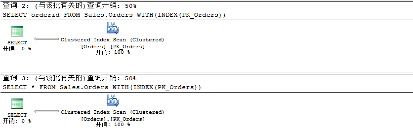 USE TSQL2012GOSELECT orderid FROM Sales.Orders WITH(INDEX(PK_Orders))SELECT * FROM Sales.Orders WITH(INDEX(PK_Orders))