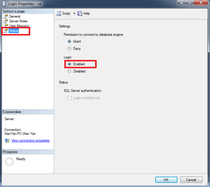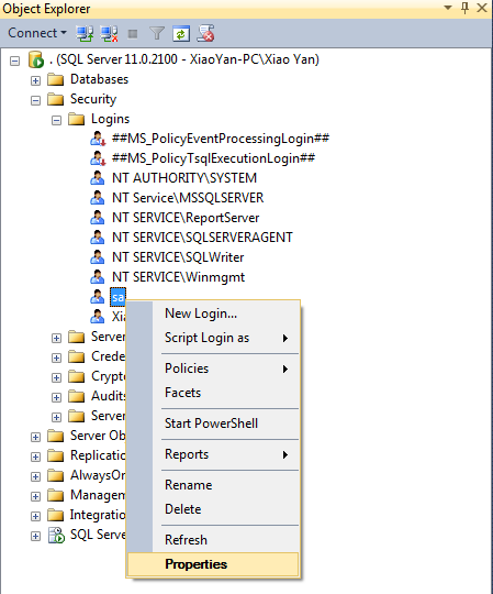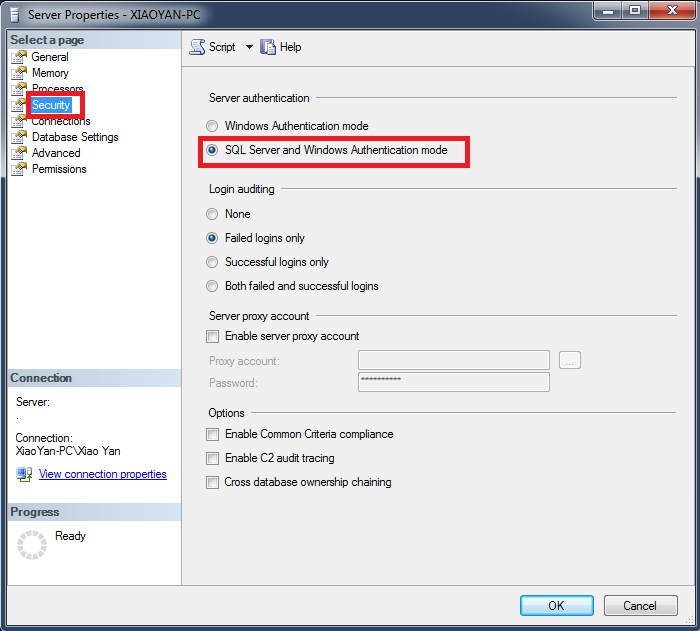 如果安裝的時候沒有選擇“混合登錄”,那么可以先WindowsAuthertication登錄進去后修改配置: