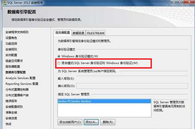 2. 數據庫引擎設置,選擇“混合模式”,給系統管理員sa設定登錄密碼。