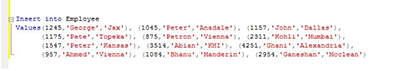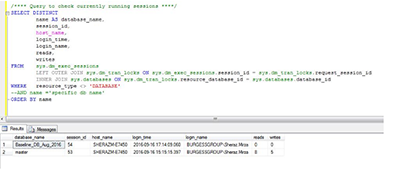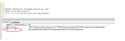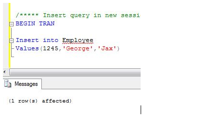 /****Creating dummy table Employee ****/ CREATE TABLE Employee ( Empid int NOT NULL, Name nchar(10) NULL, City nchar(10) NULL ) ON [PRIMARY] GO /**** Insert dummy data in Employee table *****/ Insert into Employee Values(1245,'George','Jax'), (1045,'Peter','Anadale'), (1157,'John','Dallas'), (1175,'Pete','Topeka'), (875,'Petron','Vienna'), (2311,'Kohli','Mumbai'), (1547,'Peter','Kansas'), (3514,'Abian','KHI'), (4251,'Ghani','Alexandria'), (957,'Ahmed','Vienna'), (1084,'Bhanu','Manderin'), (2954,'Ganeshan','Mcclean')/***** Insert query in new session ****/ BEGIN TRAN Insert into Employee Values(1245,'George','Jax') /**** Query to check currently running sessions ****/ SELECT DISTINCT name AS database_name, session_id, host_name, login_time, login_name, reads, writes FROM sys.dm_exec_sessions LEFT OUTER JOIN sys.dm_tran_locks ON sys.dm_exec_sessions.session_id = sys.dm_tran_locks.request_session_id INNER JOIN sys.databases ON sys.dm_tran_locks.resource_database_id = sys.databases.database_id WHERE resource_type <> 'DATABASE' --AND name ='specific db name' ORDER BY name/**** update query in new session ****/ update Employee set name = 'SHERAZ' where empid = 1245 /**** Query to check blocking queries with session id ****/ SELECT session_id, blocking_session_id, text FROM sys.dm_exec_requests CROSS APPLY sys.dm_exec_sql_text(sql_handle); /*** Command if you want to kill blocking session ****/ kill (54)