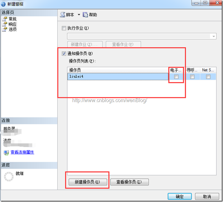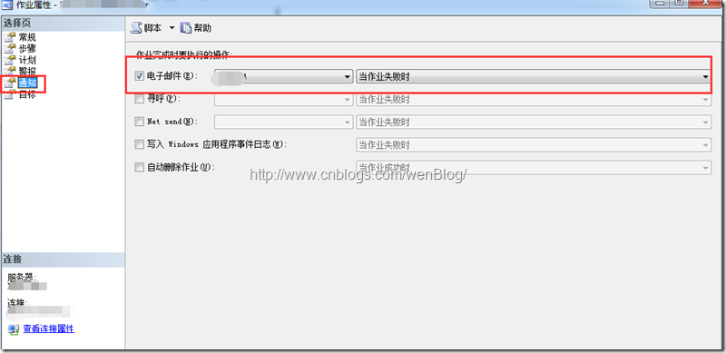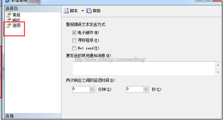 如下圖所示,可以設定警報錯誤發送的方式,可以選擇[E-mail]、[Pager]、[Net send]復選框(可多選),同時可以填寫在發送警報的同時給出的通知消息,并能夠對響應的間隔時間進行設定。