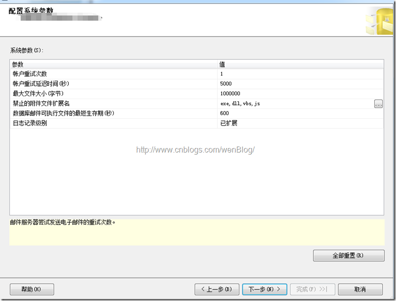 然后,可以修改“配置系統參數”,比如賬戶重試次數,禁止的附件文件擴展名,單擊下一步,,默認配置即可: