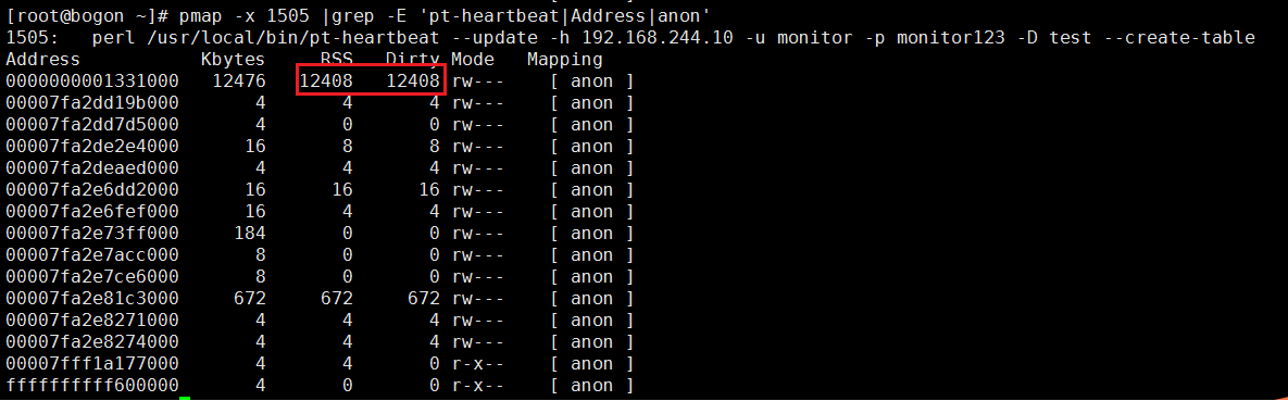 同時(shí),通過(guò)pmap命令,發(fā)現(xiàn),0000000001331000地址的RSS和Dirry也會(huì)增長(zhǎng),增長(zhǎng)的速率是4k/s