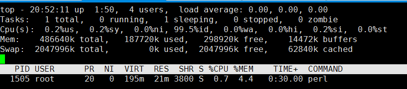 同樣CPU時(shí)間后,MEM增長(zhǎng)到4.4%, 增長(zhǎng)了1%,考慮到內(nèi)存500M,該進(jìn)程的內(nèi)存占用增加了5M,雖然不是很多,但考慮到進(jìn)程的內(nèi)存增加并沒(méi)有停止的意思,這個(gè)現(xiàn)象還是要引起注意的。